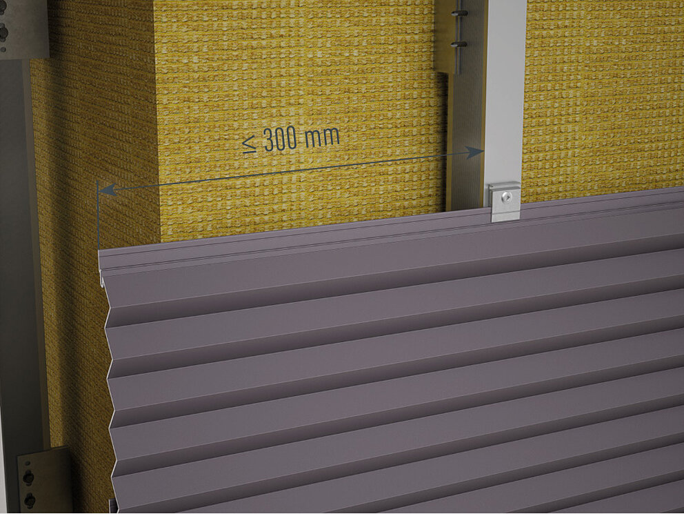 Pay attention to the recommended max. overhang for PREFA Extruded Profiles as specified in the static requirements for unsupported corners/edge zones of max. one quarter of the substructure spacing: