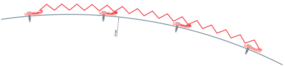 PREFA extruded profiles can also be installed on rounded subsurfaces even with vertical profile installation. For the construction width of 200 mm, the minimum radius of r ≥ 1,250 mm must be observed.