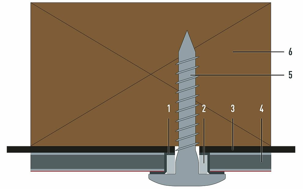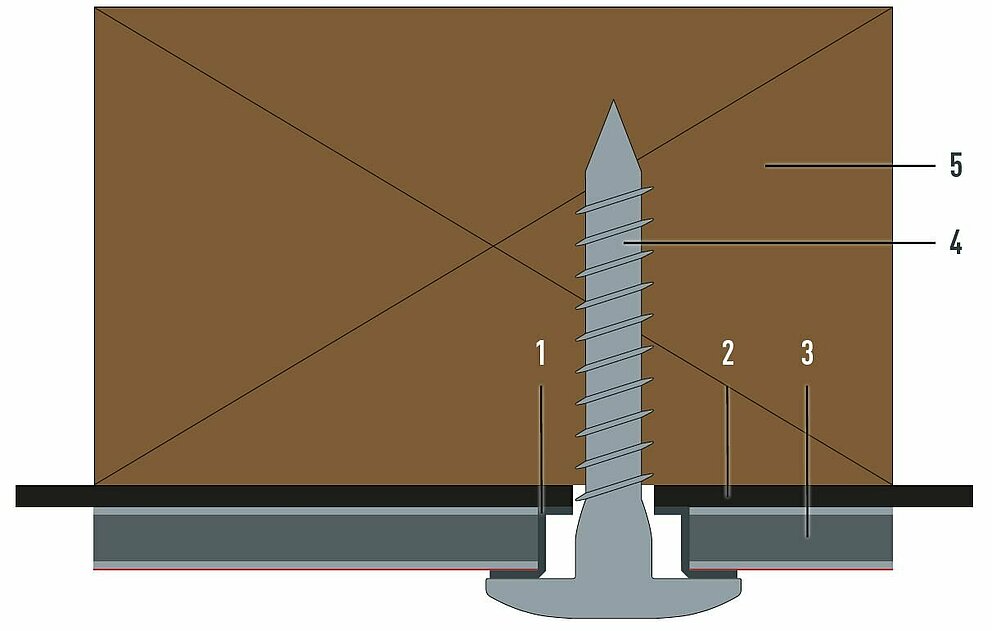 For mechanical fastening to a wooden substructure, the sliding point is designed in the same way as the fixed point. The only difference is that no bushing is inserted into the façade-centring joint.