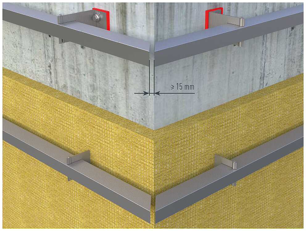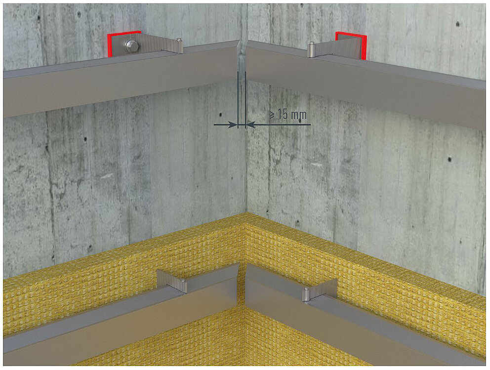 Vertically installed substructures must not join at corners; An expansion gap of approx. 15 mm should be provided. Fix and sliding points should be considered to allow for thermal movement.