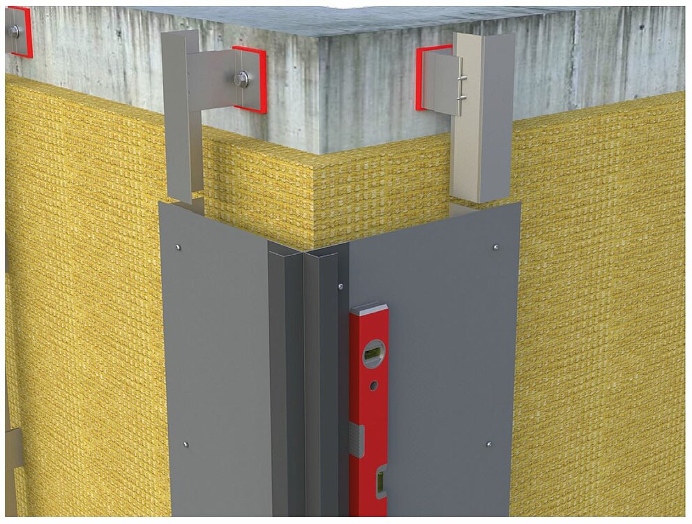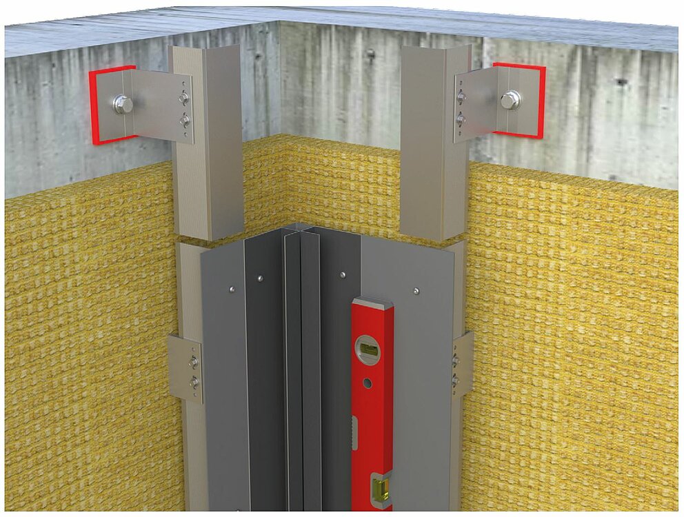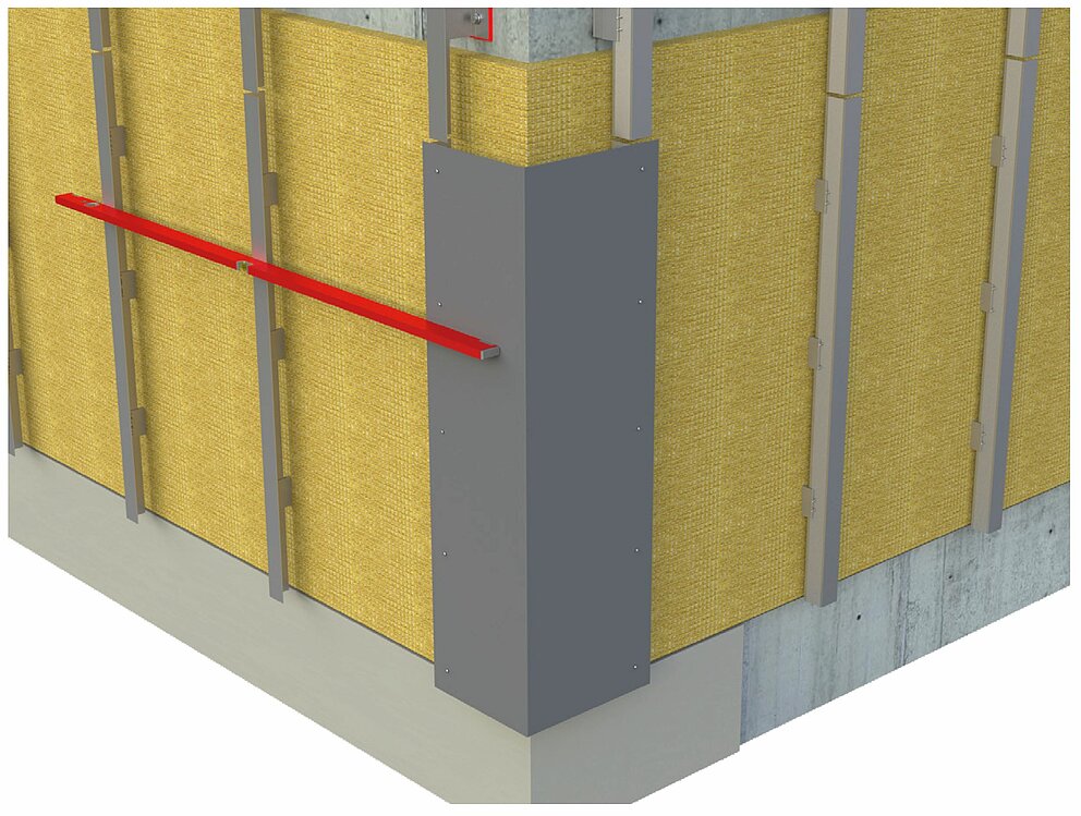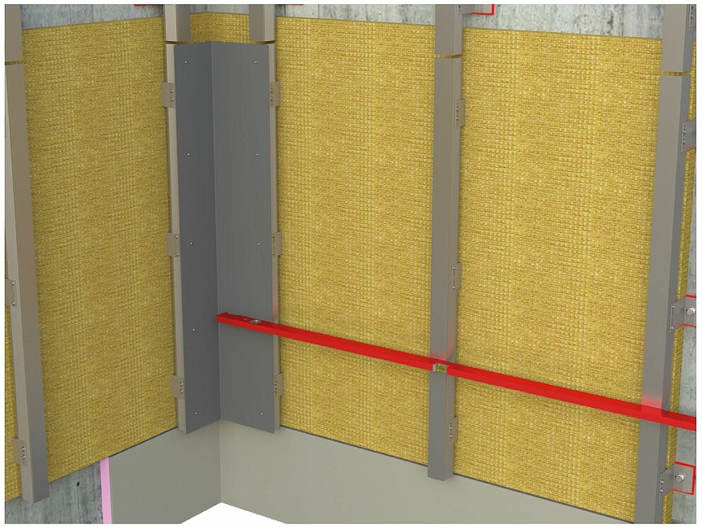 To install the internal or external corner, prepare the substructure for a horizontal profile installation. To install the internal or external corner profiles, you must first connect the vertical sub-structure framework using an angle bracket made from an aluminium sheet 2 mm in thickness or galvanised steel sheet (1 mm). Take account of the support profiles when installing the actual sub-structure framework itself in order to position the material thickness of the angle bracket closer to the inside, so as to guarantee that the sub-structure framework is even.