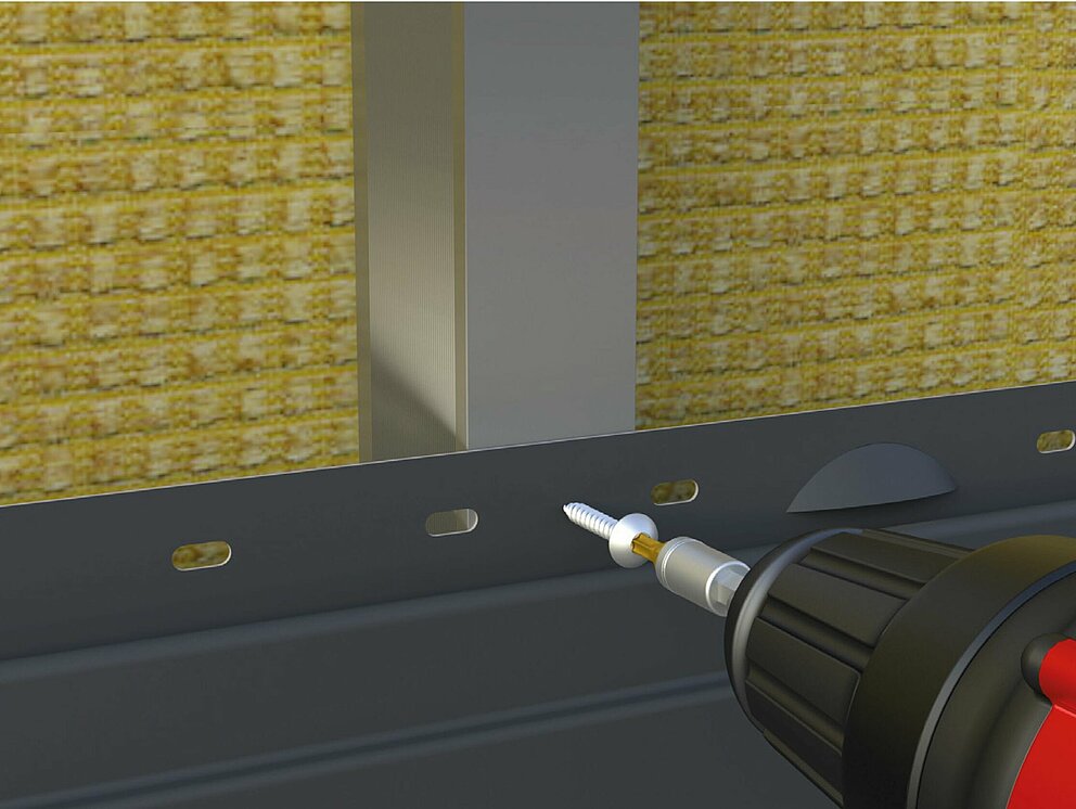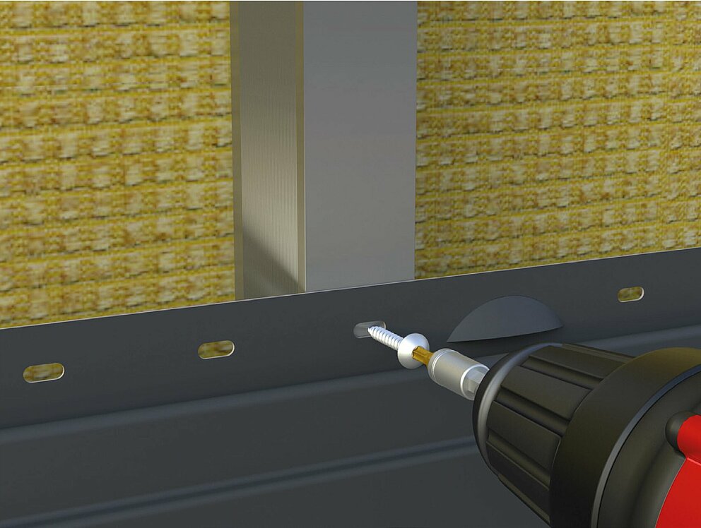 The fastening screw is fixed centrally through the pre-punched hole in the fastening strap into the support profile. If no pre-punched hole is placed directly over the supporting rail, a punching tool should be used to make an elongated hole to allow unobstructed expansion, for example, in order to enable tension-free expansion of the siding.