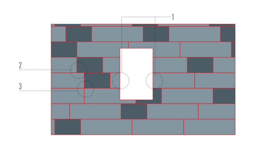 A clipped FX.12 panel was reused on the other side of the opening (1). Thus, a correct pattern is no longer guaranteed (2) and in the worst case can lead to an overlapping of vertical joints (3). For this reason, installation examples were created for an optimal joint offset.