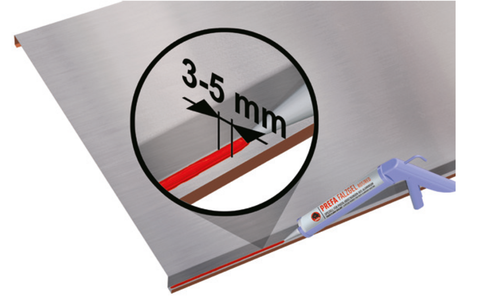 The lower the roof pitch, the greater the risk of water ingress through the fold under the metal roofing due to driving rain, snow or retained water. For roof pitches up to 7°, special sealing measures are therefore required, e.g. the use of PREFA sealing gel.