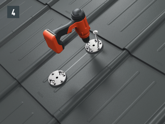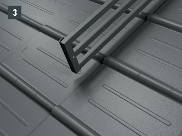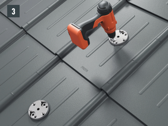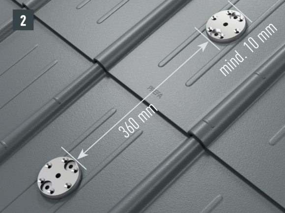 Do not place and fasten foot sections on the fold or crest of the PREFA roof coverings. Observe mounting areas on the respective roof products. It may be necessary to fit a base plate (e.g. if there is a rebate or crest in the area of the rafters).