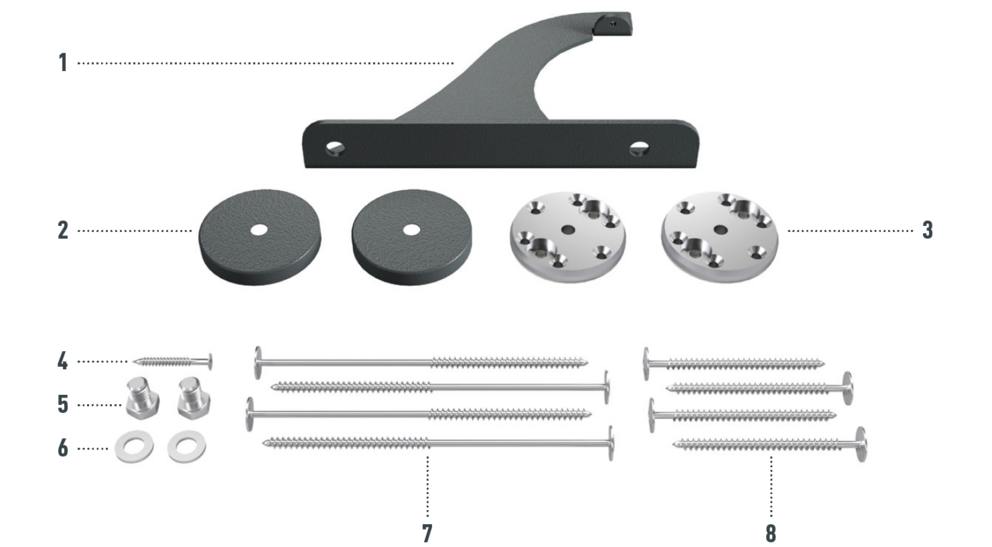 Made of colour-coated, high-strength aluminium alloy, consisting of two foot parts with surface seal, snow rake hook and fixing slider, incl. fastening material. |