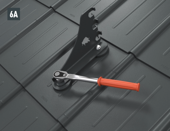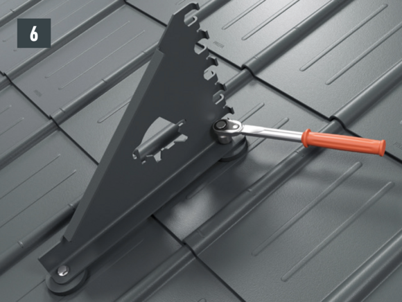 Mounting of the mountain snow guard bracket with two hexagon head screws (M12) to the foot parts (SW19; torque: 35 Nm) for roof tiles (Fig. 6A), shingles (Fig. 6B), rhomboid roof tiles (Fig. 6C), R.16 and FX.12 (Fig. 6D).