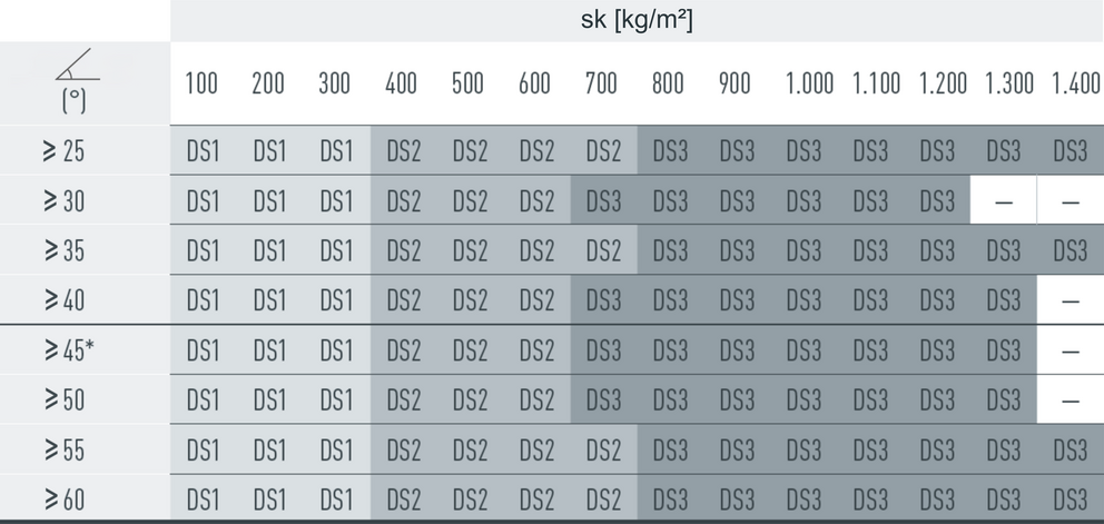 The snow guards are installed according to the following installation patterns, depending on the snow load and roof pitch. The applicable installation patterns are shown in the tables listed below. Observe the information on the roof pitch in the vertical direction and the snow load on the ground (sk) in the horizontal direction. The snow loads (sk) to be considered for the respective construction project must be taken from the national standards and regulations.