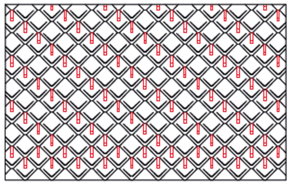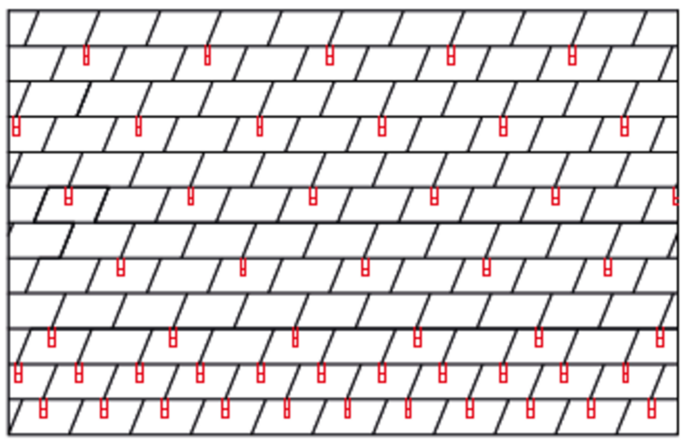 Snow guards are respectively pushed up into the centre of the punching in the rhomboid roof tiles 44 × 44 and fastened with at least 2 grooved nails. The number of fastenings in the rhomboid roof tiles 44 × 44 is not affected by the use of snow guards. With rhomboid roof tiles 44 × 44, 1.3, 2.6 or 5.2 snow guards are installed per m² (see table below - Installation patterns DR44 1, DR44 2 and DR44 3). The first two rows (starting plates for rhomboid roof tiles 44 × 44 and the first row of rhomboid roof tiles 44 × 44) must be equipped with snow guards throughout.