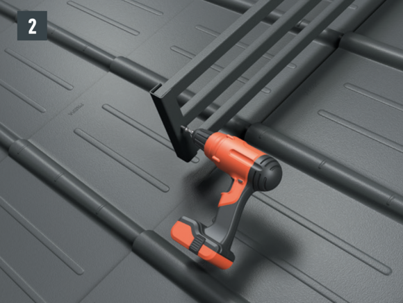 For attachment to the rafter, the drill holes (∅ 8.5 mm) must lie on the axis of the snow rake hook (course of the rafter) - Fixing screws in one axis with the rafter. Remove rear protective film on the foot parts, position and stick on (Fig. 2).