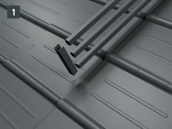 The snow rake brackets are installed with two foot parts on the roof membrane. The insert profiles are inserted into the snow rake hook and fastened with a fixing slider. The insert profiles are then connected to each other using sockets - Total height with foot parts: 219 mm.