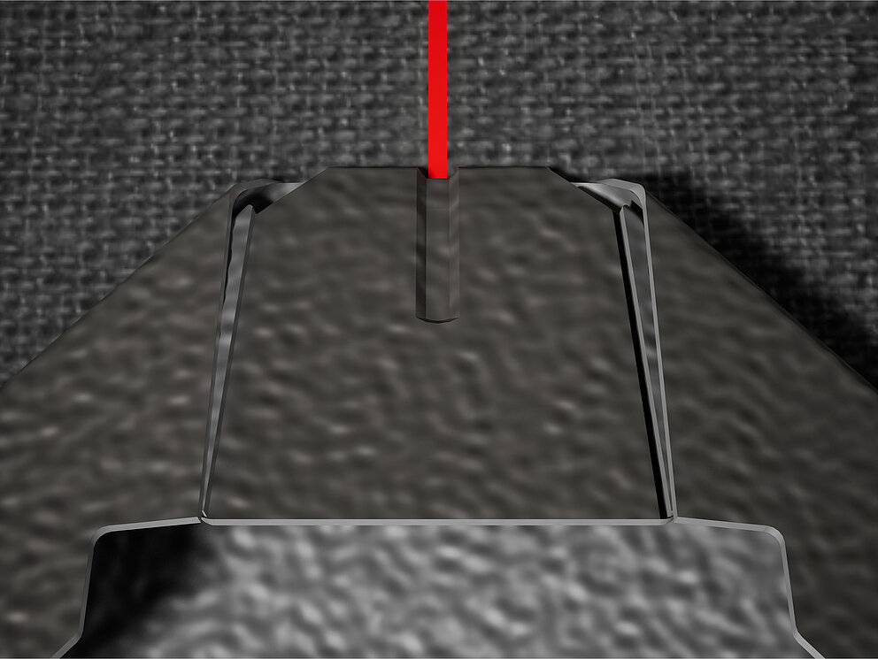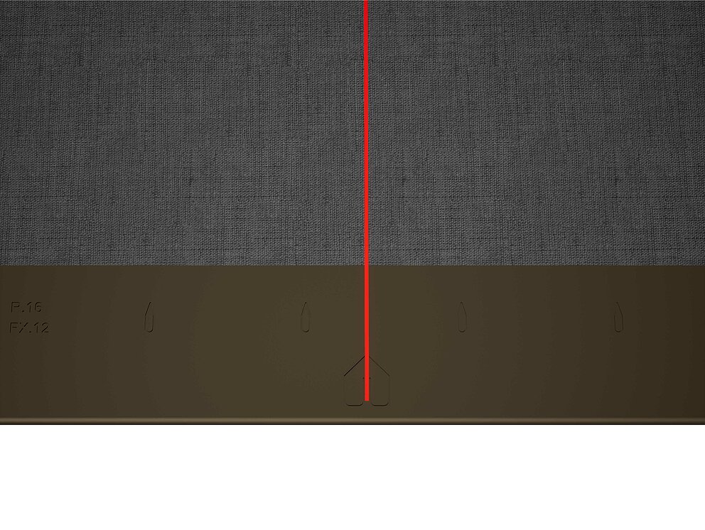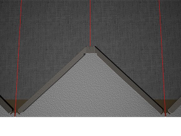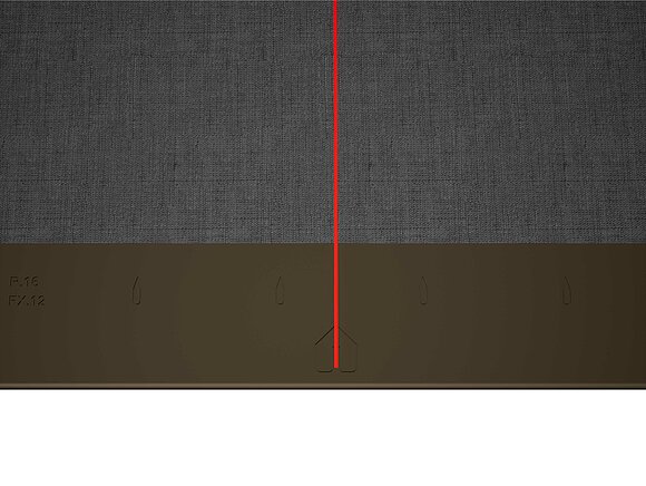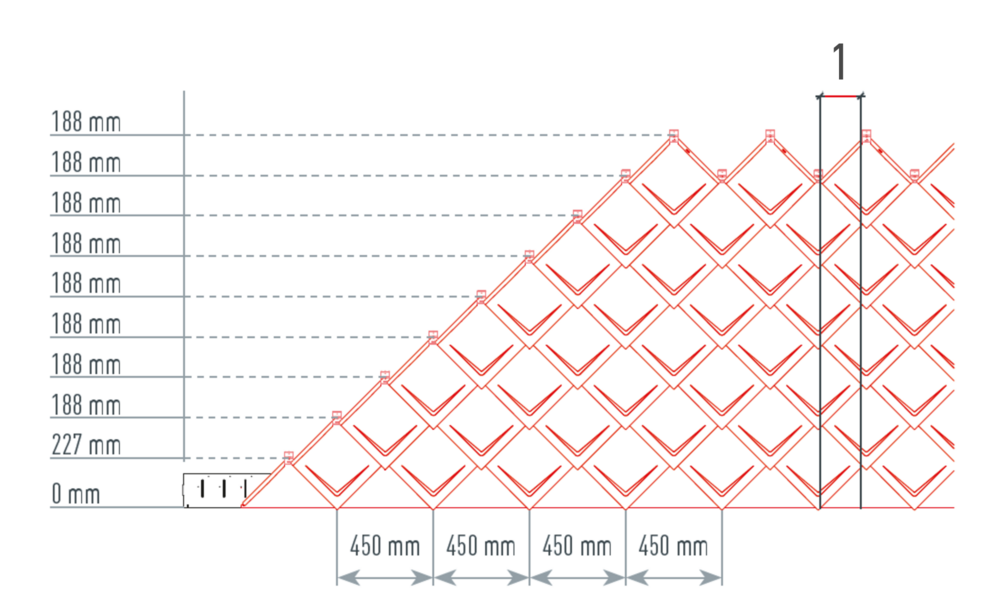 To help with the installation of the PREFA rhomboid roof tiles 29 × 29, it is advisable to create a grid of vertical lines at a distance of 450 mm (the markings in the starter strip can be used as a guide). In order to keep the dimension exact in each row, half of the layout dimension can also be marked and checked at regular intervals if necessary. Align the starting plates with the notches (on the top edge of the starting plates) on the vertical lines (see figure below). It should be noted that the area for the lateral upstand (e.g. verge formation) is not in the centre of the rhomboid roof tiles 29 × 29 (observe symmetry/middle of the roof).
