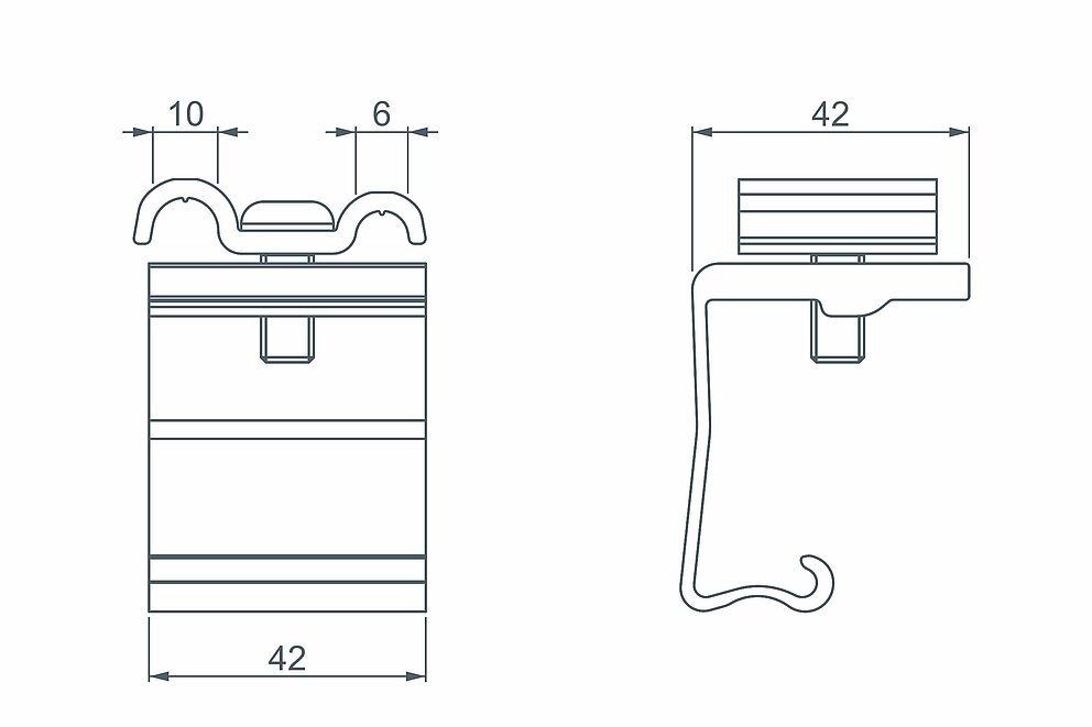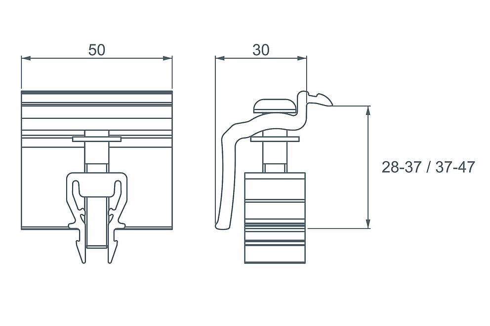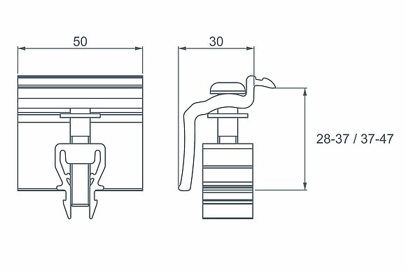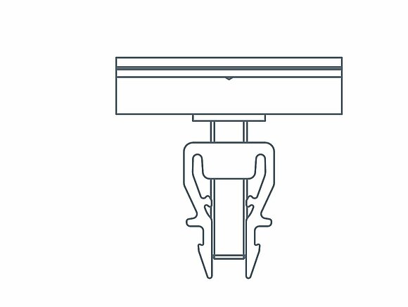 The cable clip is inserted diagonally from below into the groove of the rail and clipped into the rail by applying pressure diagonally upwards.