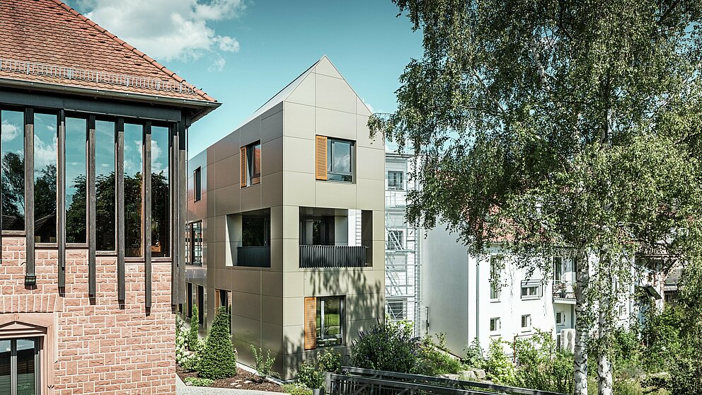 The architecture of the new town hall stands out thanks to its modern, monolithic structure. The building was given an asymmetrically shaped gable roof, which emphasises its modern design. Instead of the half-timbered or sandstone façades typical of the region, the architects opted for bronze-coloured PREFABOND aluminium composite panels. These give the building a timeless character and make it stand out clearly from its surroundings. The new town hall thus blends in perfectly with the town's ensemble, which consists of the original historic town hall and an extension dating from the 1980s.