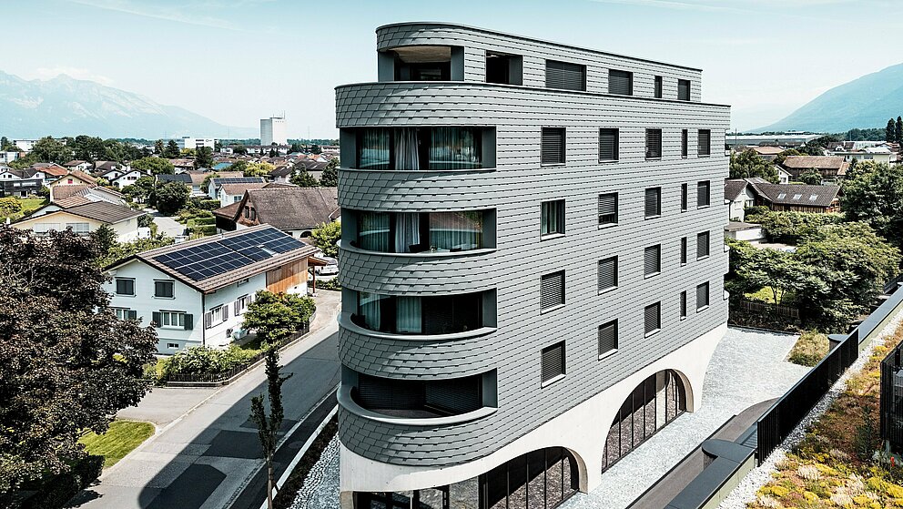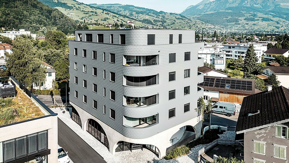 ‘Architecturally appealing, technically a major challenge,’ says Gabriel Landolt from Künzli Davos. The long-established Swiss company created the scale-like façade and has relied on the quality of PREFA for years: ‘On the one hand, the material is very light and at the same time weather-resistant. Visually, it is possible to create a homogeneous surface that is stylistically timeless and particularly durable. Like all PREFA products, the wall shingles used in Buchs are low-maintenance. And the aluminium can be sustainably recycled as a secondary raw material.’
