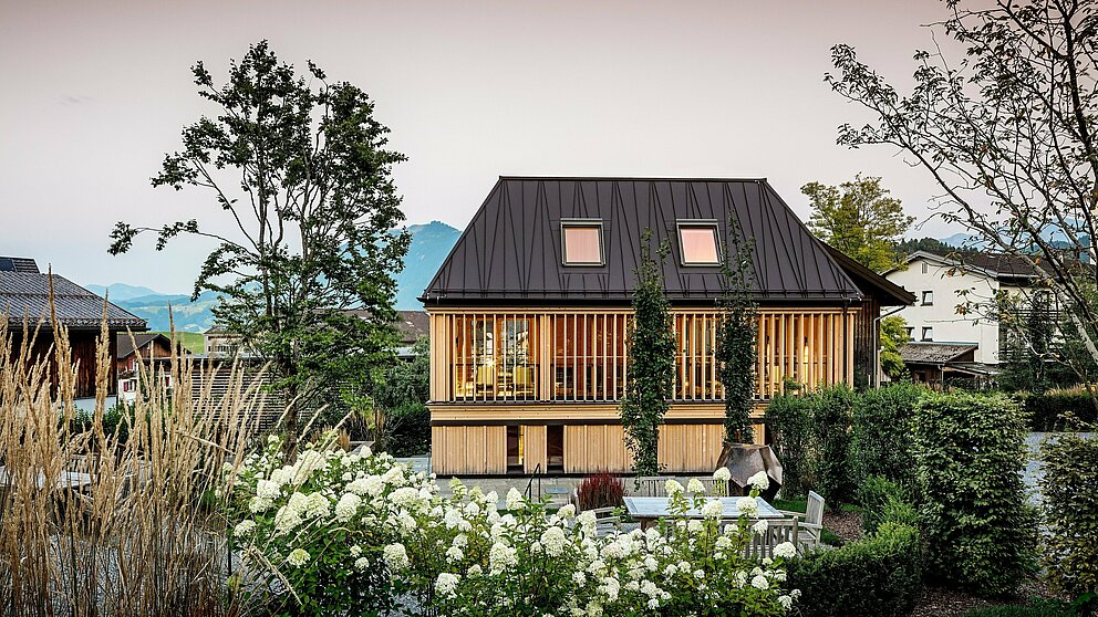 Das „Badehaus“ des Hotel Hirschen in Schwarzenberg in einem klaren, natürlichen Licht. Im Fokus steht das außergewöhnliche PREFA Stehfalzdach in P.10 Nussbraun mit seiner präzisen Ausführung und den markanten, teils diagonal verlaufenden Stehfalzen. Zwei Dachfenster sorgen für natürliches Licht im Inneren. Die Fassade ist mit geschoßhohen, vertikal angeordneten Holzlamellen gestaltet, die sowohl gestalterisch als auch funktional zur Geltung kommen. Im Vordergrund führen Natursteinplatten durch einen gepflegten Gartenbereich. Umgeben von traditionellen Holzhäusern und sanften Hügeln fügt sich das moderne Gebäude harmonisch in das Ortsbild des Bregenzerwaldes ein.